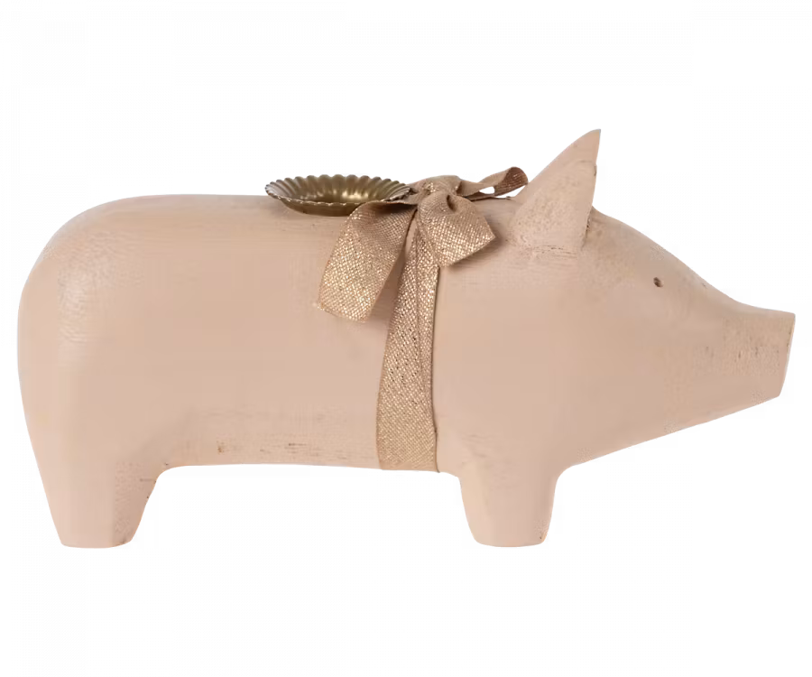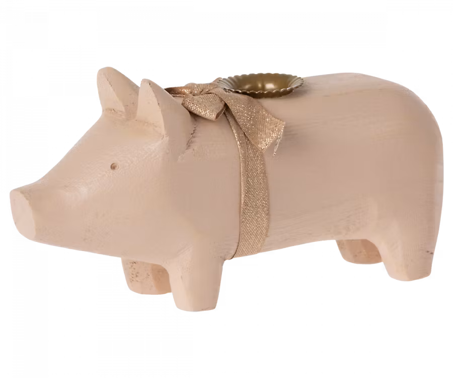 En underbar handgjord ljusstake i trä med ett vackert glittrande band knutet i rosett runt magen. Varje gris är omsorgsfullt snidad och unik.