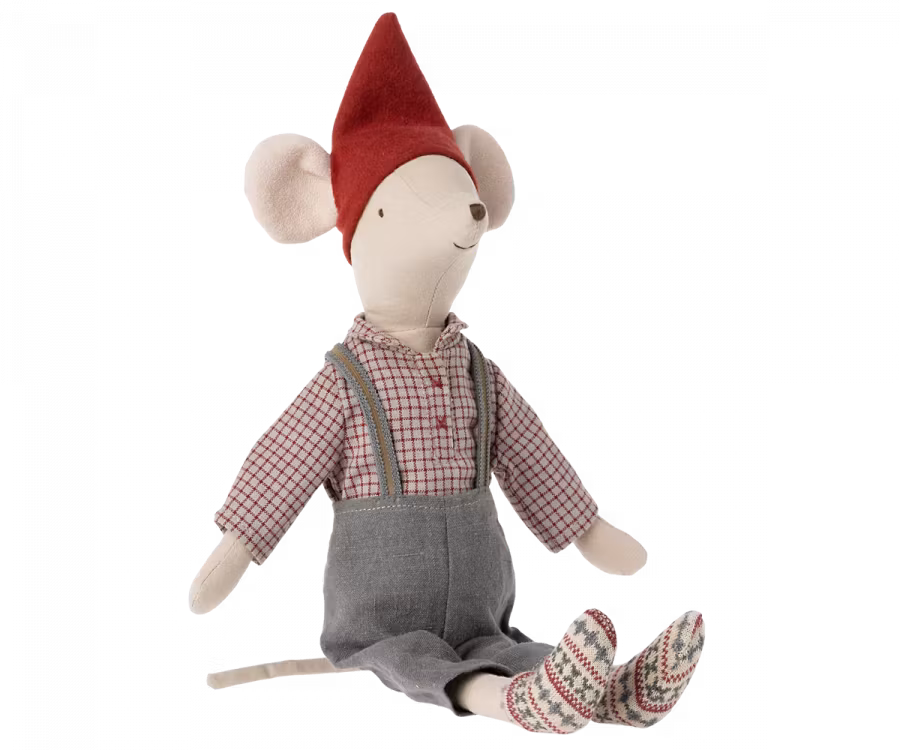 Maileg Julmus Medium Pojke med Hängselbyxor och Röd Luva