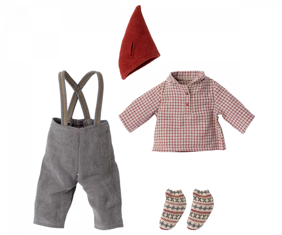Säg hej till julens sötaste nisse! Han har på sig grå hängselbyxor, en smårutig skjorta, stickade sockor och (såklart) en söt tomteluva på huvudet.