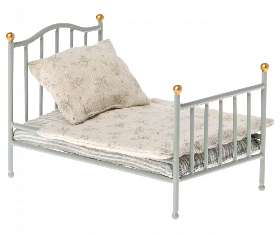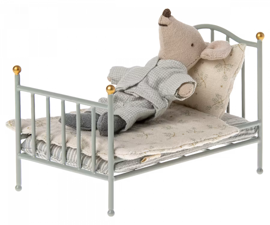 Maileg Säng i Metall Liten Mint Blå - Blå Blommig Bäddning