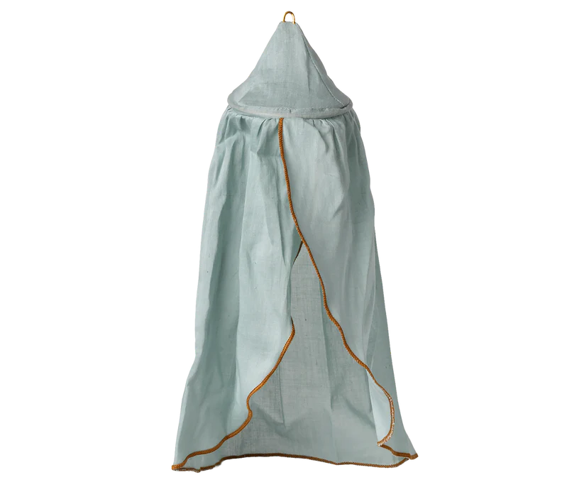 Fantastisk sänghimmel ifrån Maileg till de små vännerna. Den är gjord i ett vackert blått bomullstyg med en guldbroderad kant upptill.