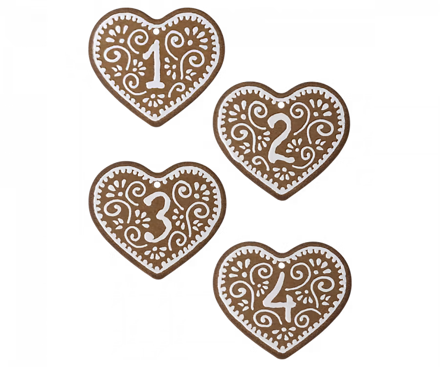 Söta siffror 1-4 som blir perfekta att sätta på dina adventspaket. De små hjärtana är tillverkade av kraftig papp och ser precis ut som fina pepparkakor redo att användas år efter år.