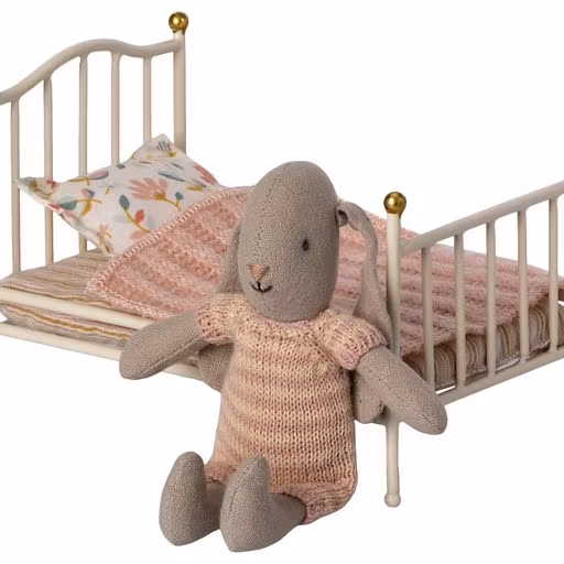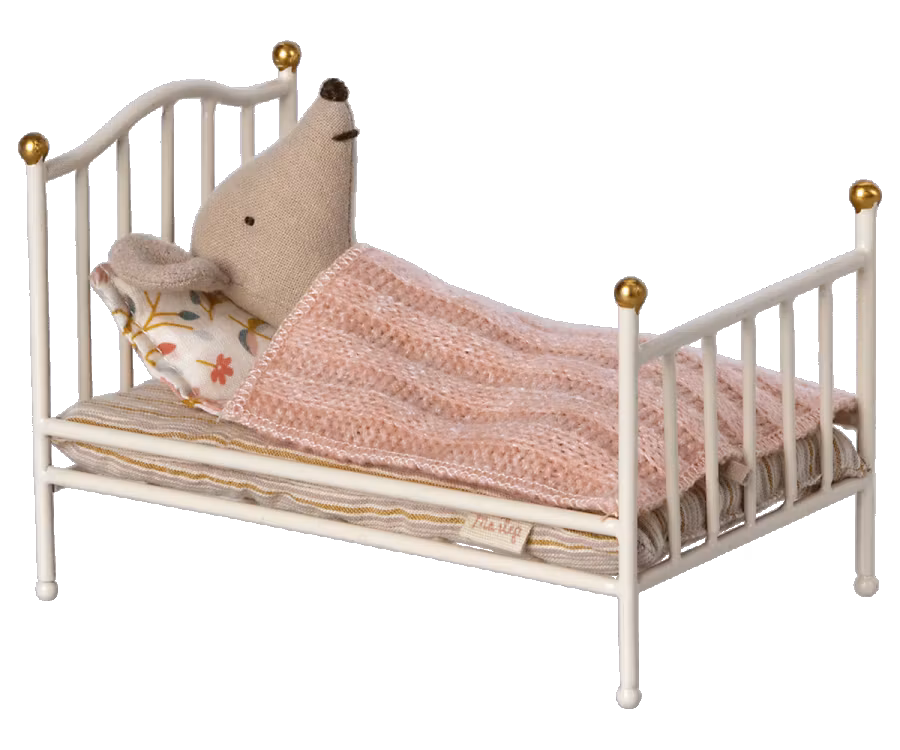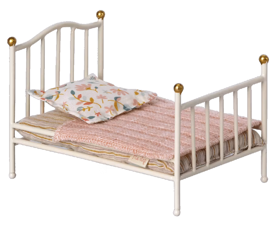 Sötaste sängen i vitlackerad metall med guldfärgade knoppar. Sängen är mjukt bäddad med madrass, kudde och mysig filt. Den passar perfekt till möss av storlek Lillasyster.