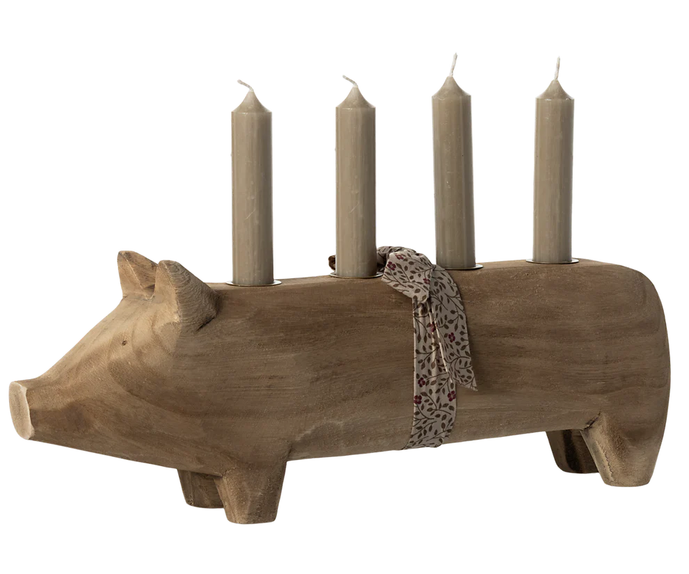 Julens vackraste ljusstake ifrån Maileg gjord i rent trä med ett vackert band knutet om magen. Ljus med omkrets ca 2 cm passar fint till.